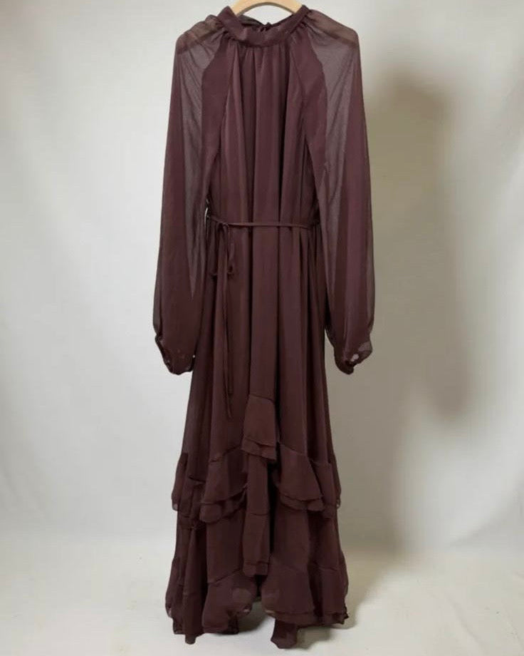 Designed for evenings that call for quiet elegance, the Ombre Dress floats effortlessly with every step. The high gathered neckline and fluid long sleeves evoke vintage refinement, while the cascading layered hem brings a modern, sculptural rhythm to the silhouette. A thin matching belt cinches the waist delicately, creating a balanced harmony between softness and structure.