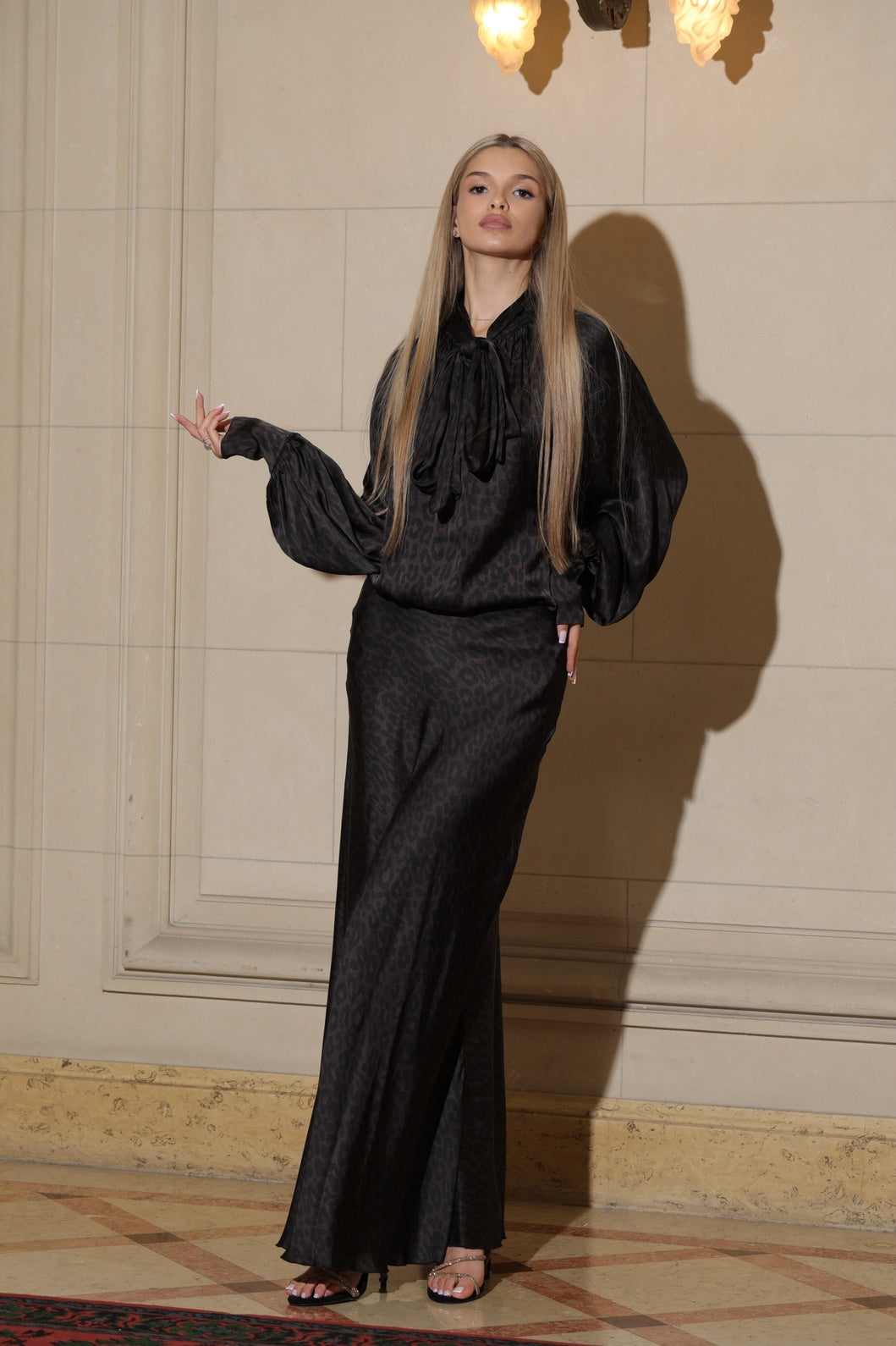 A sleek two-piece ensemble crafted in a deep shadow-toned leopard print. The fluid blouse features voluminous sleeves and a soft tie-neck detail, adding movement and sophistication. Paired with the matching maxi skirt, the set creates an elongated, elegant silhouette with a subtle satin sheen—perfect for evening occasions or elevated day-to-night styling.